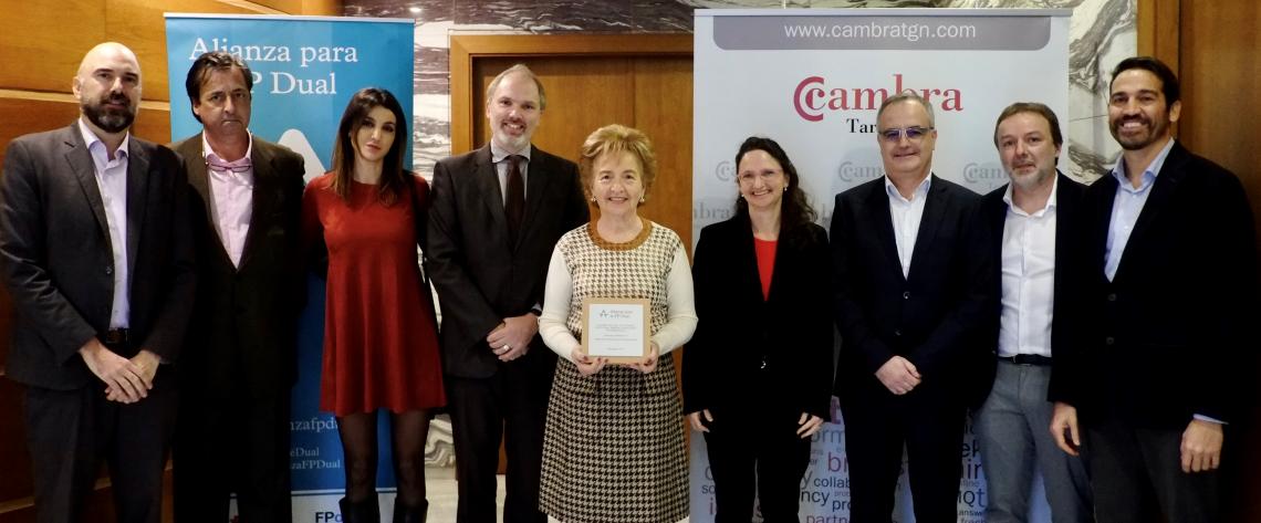 A la foto de grup, i d’esquerra a dreta, Guillem Salvans, senior project manager de la Fundació Bertelsmann; Enric Borràs, assessor tècnic de l’Alianza para la FP Dual; María Tosca, directora de Empleo, Formación y Emprendimiento de la Cámara de España; Marc de Semir, director de Comunicació de la Fundació Bertelsmann; Laura Roigé, presidenta de la Cambra de Tarragona; Carlota Torrens, assessora tècnica de l’Alianza para la FP Dual; Xavier Fabregat, assessor tècnic de l’Alianza para la FP Dual; Josep Oriol Fernández, responsable de Formació de la Cambra de Tarragona i Daniel Martín, director gerent de la Cambra de Tarragona.