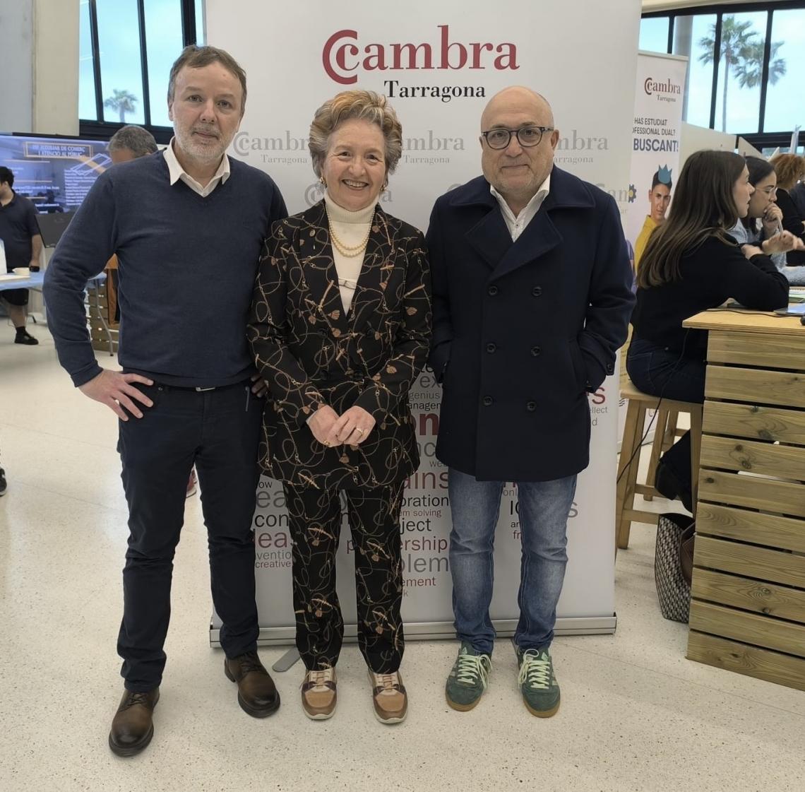 A la foto principal, Kenneth Martínez, alcalde del Vendrell; Laura Roigé, presidenta de la Cambra i Francesc Roca, secretari general d'FP, en un moment de la inauguració i benvinguda. A les altres fotos, representants institucionals com Agnès Ferré, alcaldessa de La Bisbal del Penedès; Christian Martínez, alcalde de Santa Oliva; Belén Alcón, directora dels Serveis Territorials d’Educació i FP, i Josep Oriol Fernández, director de Formació de la Cambra.