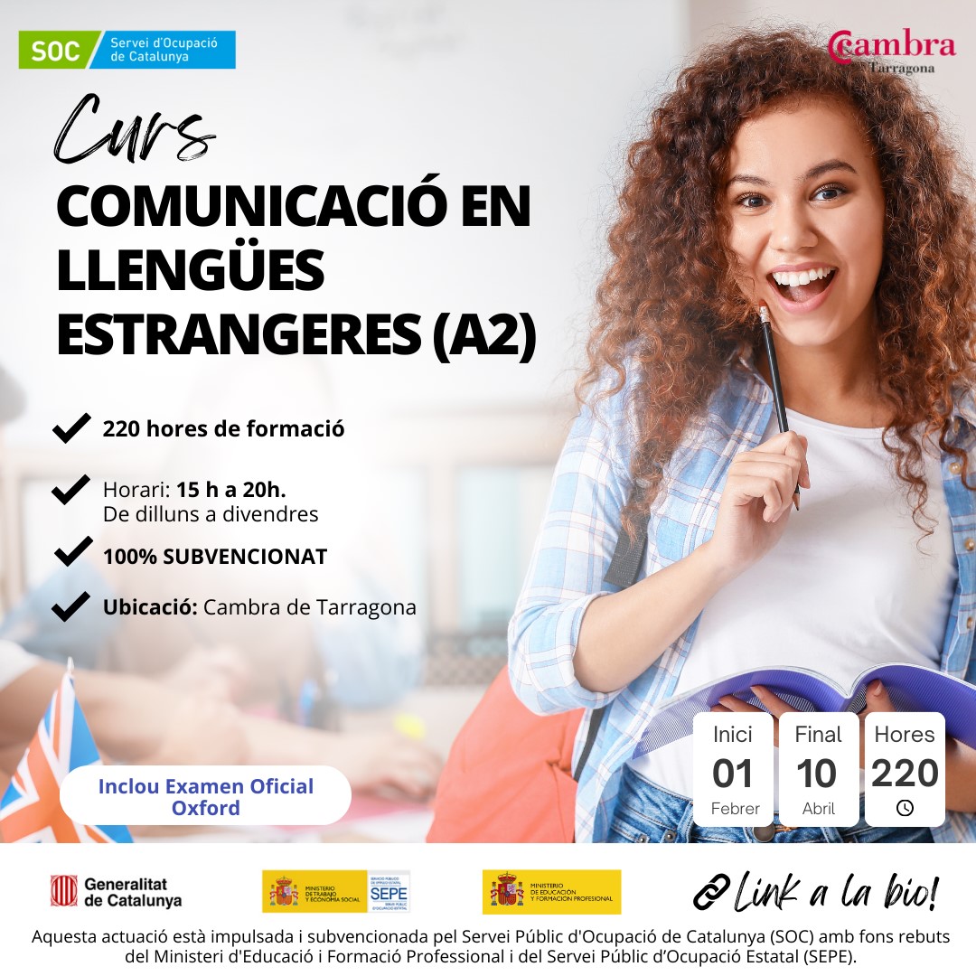 Posa els fonaments per adquirir les competències bàsiques en anglès, nivell A2, amb el nou curs de la Cambra de Tarragona, cent per cent subvencionat i dirigit, prioritàriament, a persones aturades. A més, s’inclouen els drets per a l’examen oficial d'Oxford.