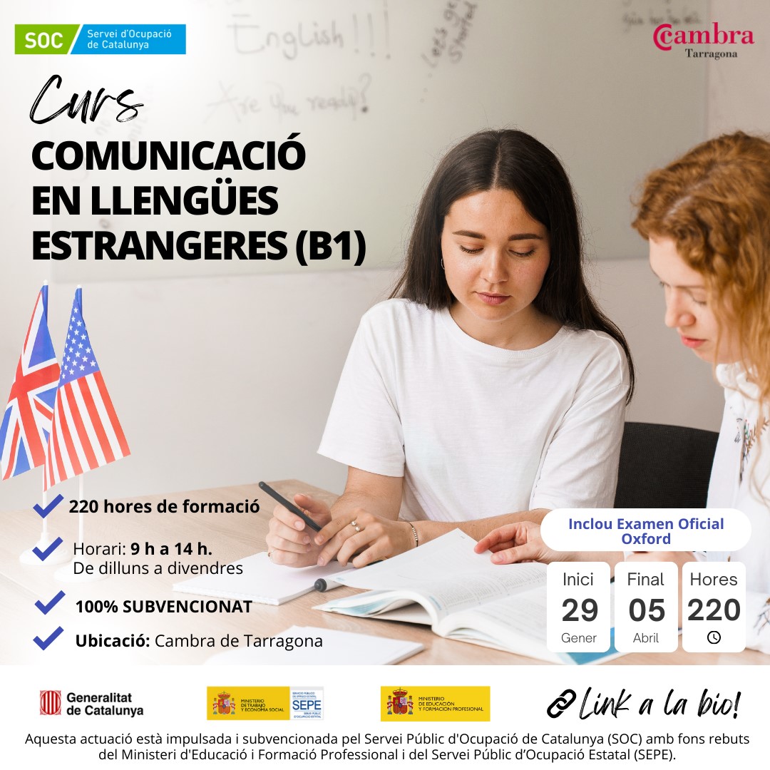 A la Cambra de Tarragona t’oferim un curs de 220 hores lectives per millorar el teu nivell anglès. Aquesta proposta formativa està subvencionada i adreçada, preferentment, a persones aturades. Començarà el 29 de gener i clourà el 5 d’abril, en horari de 9 a 14 hores.