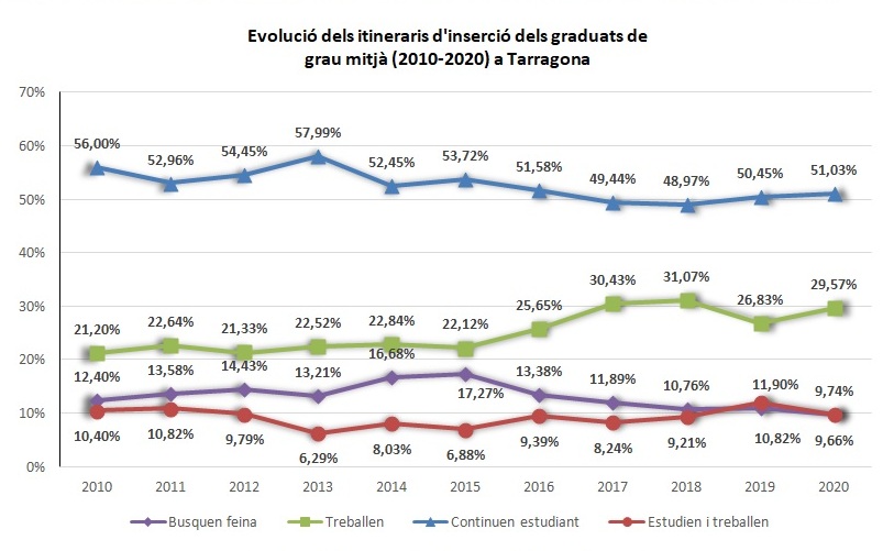 Pel que fa a les Comarques de Tarragona i respecte als graduats del curs 2020, tot i la pandèmia, cal destacar les següents dades: En els cicles de grau mig només el 9,66 per cent dels alumnes estan en recerca de feina, el 51,03 per cent segueix estudiant, el 9,74 per cent estudien i treballen, i el 29,57 per cent està treballant. Pel que fa als cicles de grau superior el 10,63 per cent està en recerca de feina, el 21,42 per cent continua estudiant, el 12,80 per cent està estudiant i treballant i el 55,15 per cent està treballant. En resum, només el 10 per cent dels graduats l’any 2020 està en recerca de feina.