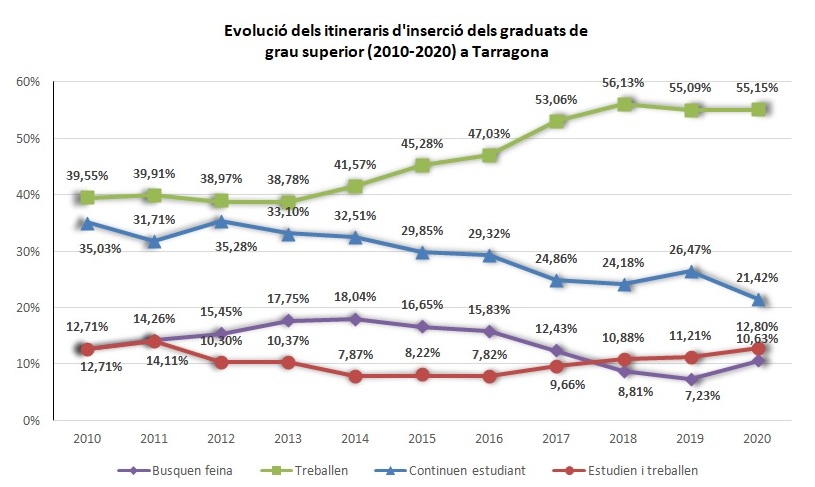 A nivell de Catalunya destacar que en el curs 2019-2020 es van superar els 50.000 graduats, xifra que no para de créixer en els últims 15 anys. Un altre aspecte a destacar, és que malgrat la situació de pandèmia actual, només el 13 per cent dels graduats estan en recerca de feina. La resta, o treballa o continua estudiant.