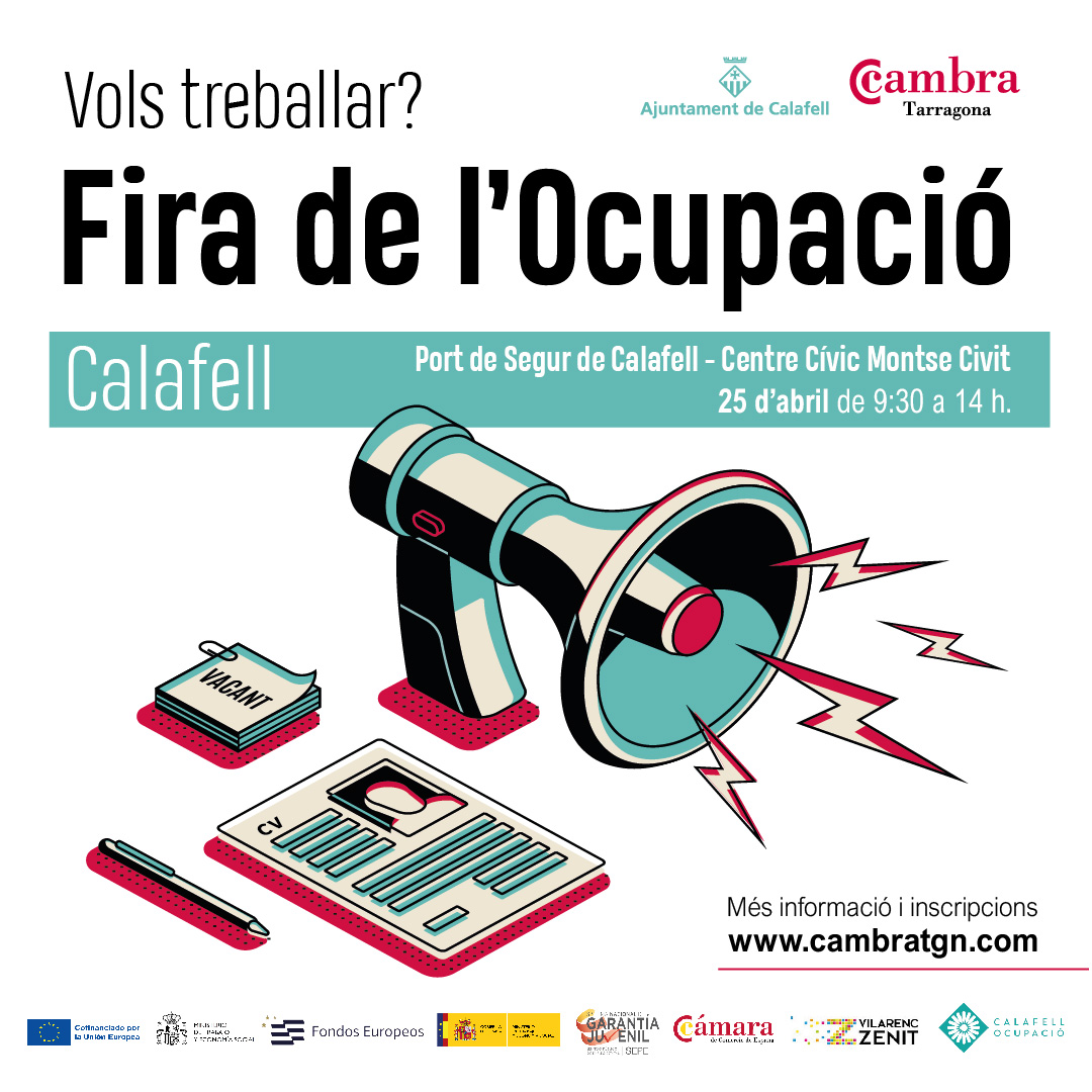 La Fira de l’Ocupació de Calafell és una iniciativa de la Cambra de Tarragona, Ajuntament de Calafell, Vilarenc Zenit i Calafell Ocupació. I el suport del Ministeri de Treball i Economia Social, Ministeri d’Educació i Formació Professional, Unió Europea, Cambra d’Espanya i Garantia Juvenil.