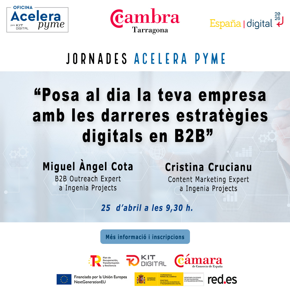 Miguel Àngel Cota, B2B Outreach Expert, i Cristina Crucianu, Content Marketing Expert, ambdós a Ingenia Projects, prendran part el 25 d’abril, a les 9,30 hores, a una nova edició del cicle de jornades Accelera Pime, que organitza la Cambra de Tarragona en format virtual.