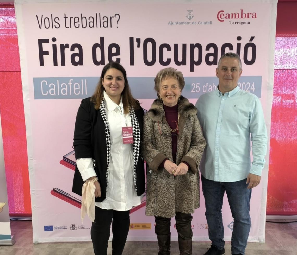 A la foto, Laura Roigé, presidenta de la Cambra de Tarragona; Ramon Ferré, alcalde de Calafell i Manal El Mesmoudi Belechgar Soussi, regidora d'Ocupació i Formació de l’Ajuntament de Calafell.